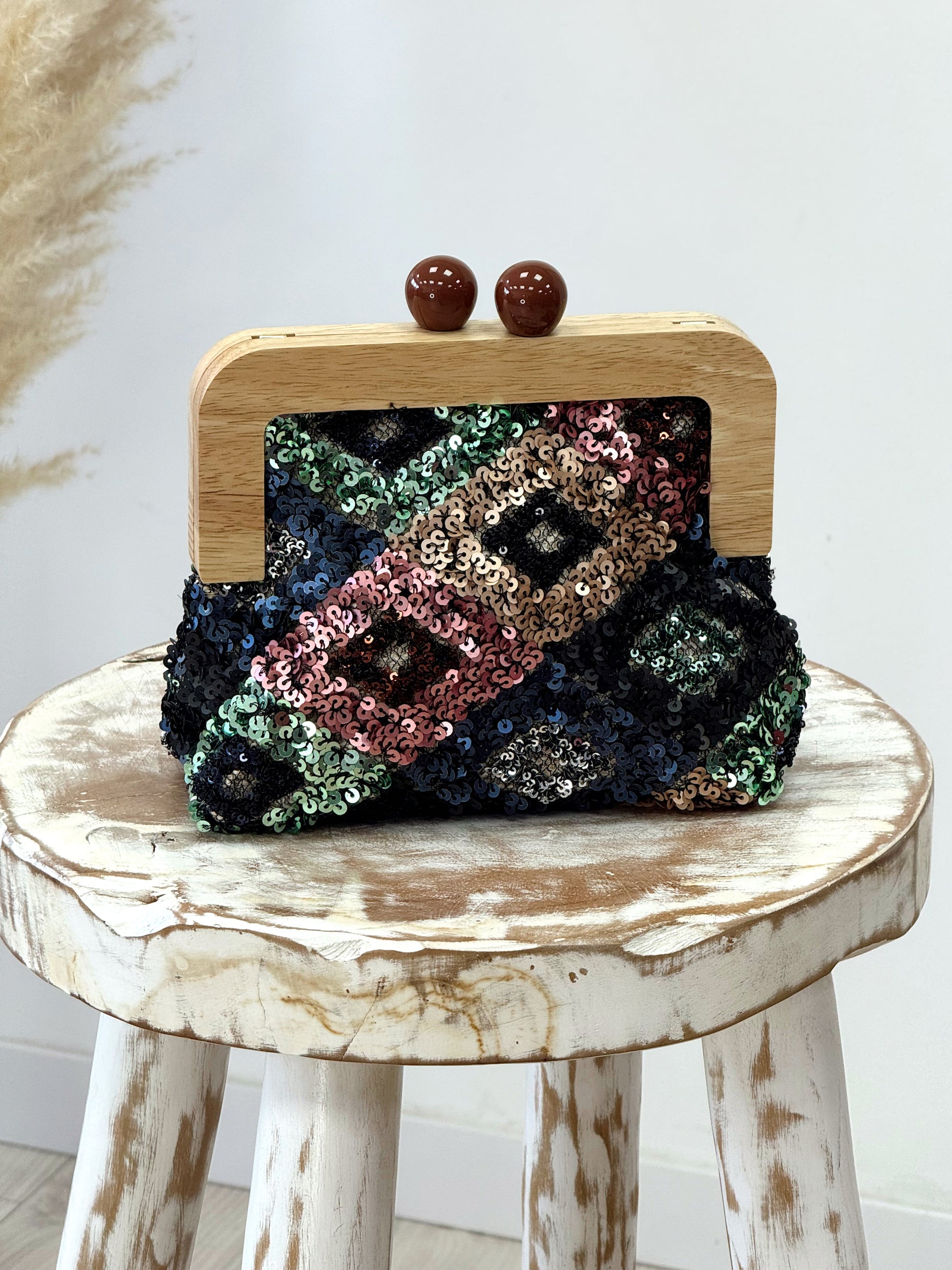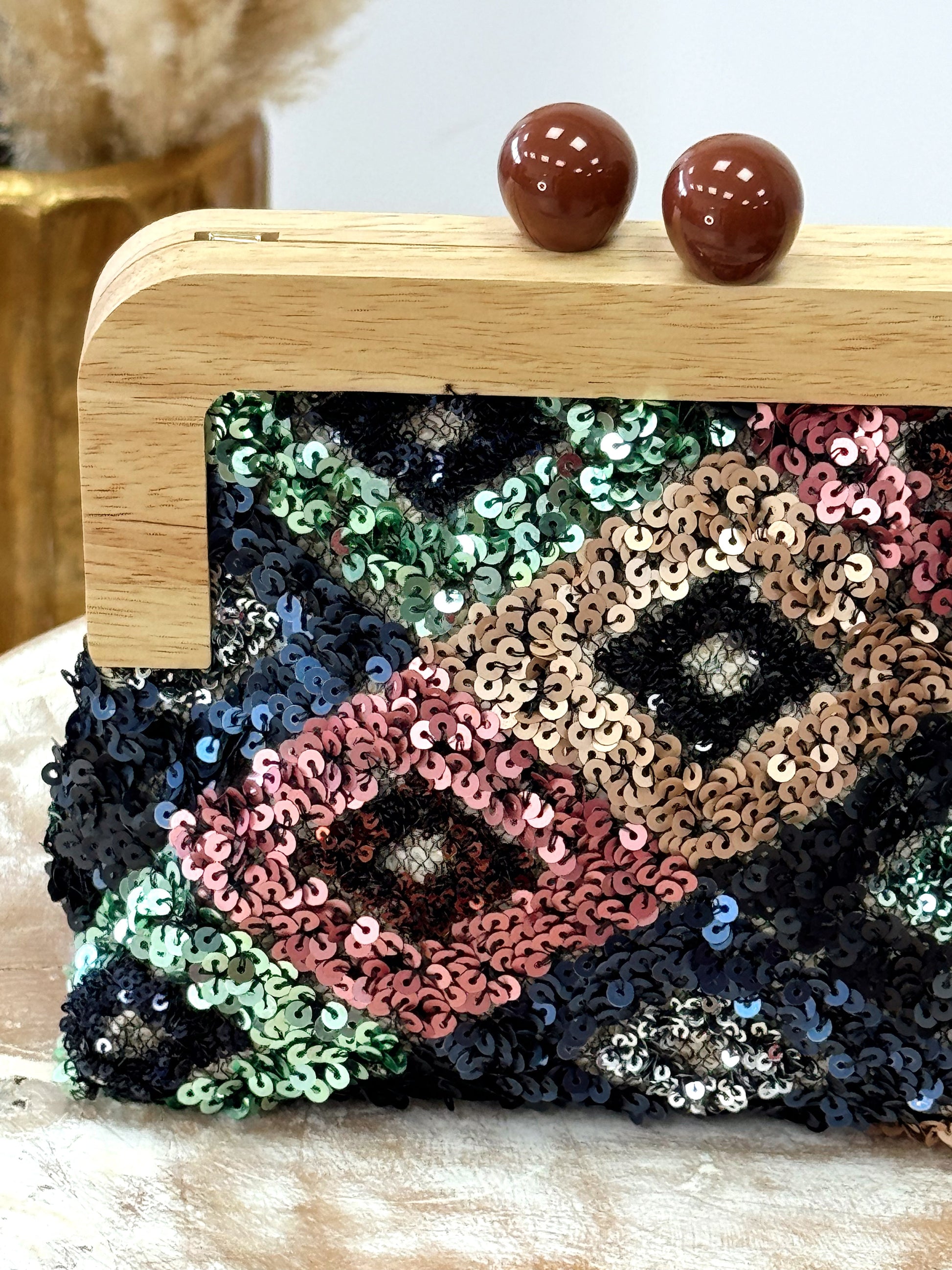 BOLSO BOMBONERA MADERA LENTEJUELAS NEGRO