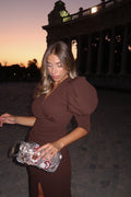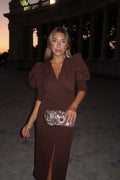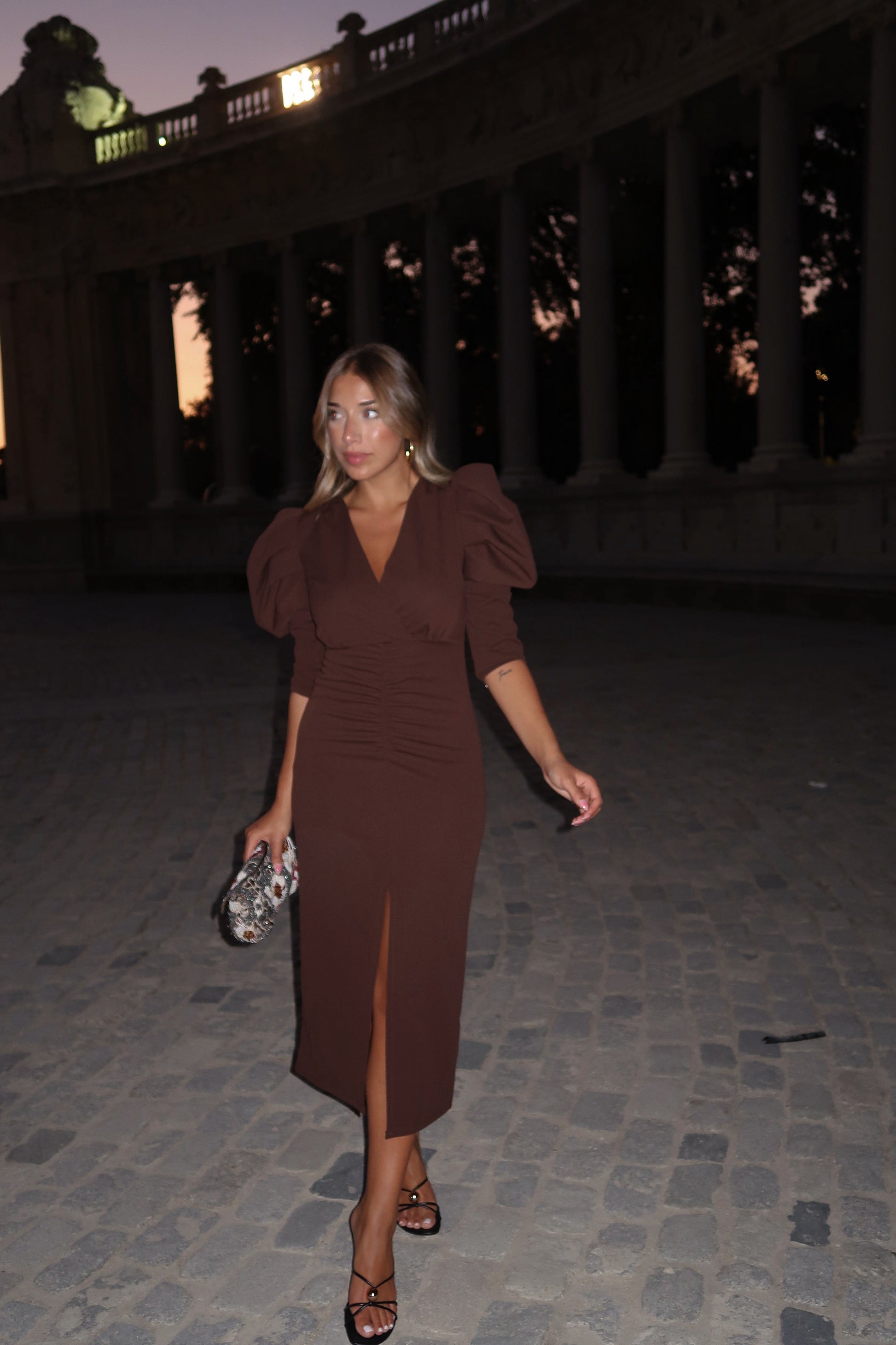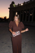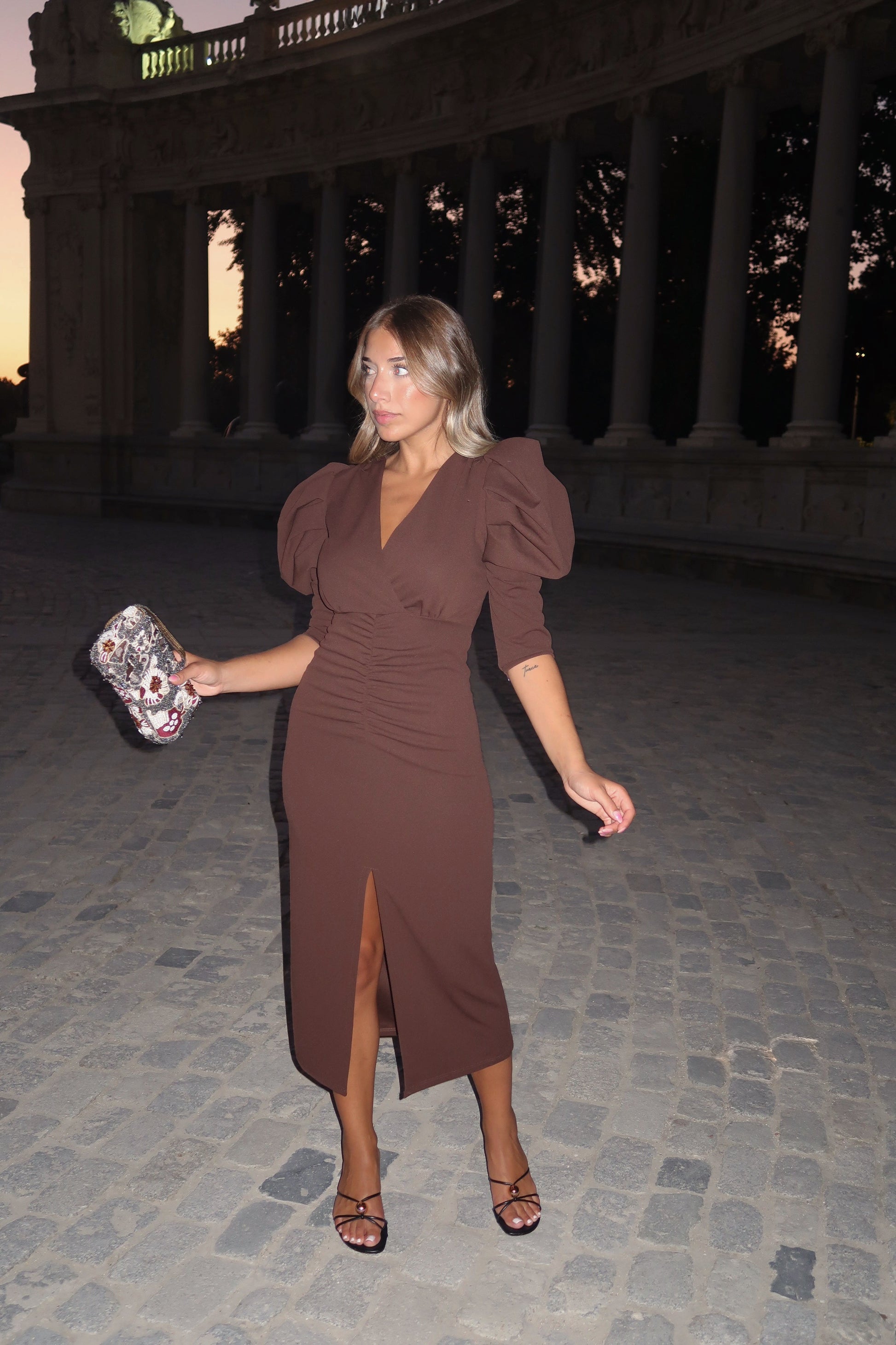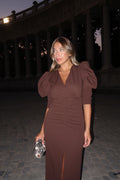 VESTIDO DRAPEADO MANGAS ABULLONADAS CHOCOLATE