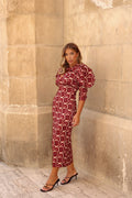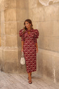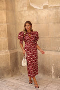 VESTIDO ESTAMPADO MANGAS ABULLONADAS GRANATE
